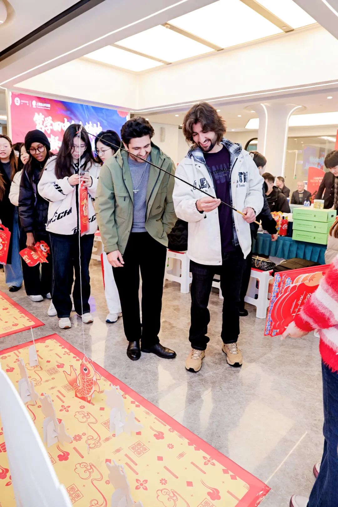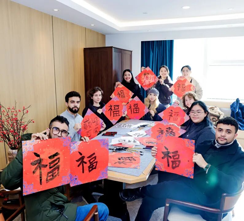 除了政策賦能與科創(chuàng)探索,一場(chǎng)充滿中式韻味的文化盛宴為活動(dòng)增添了濃厚的新年儀式感。趣味互動(dòng)區(qū)內(nèi),元旦丟丟樂(lè)、上上簽祈福、釣錦鯉贏好運(yùn)等極具中國(guó)特色的小游戲依次開展,外籍學(xué)子們?cè)谳p松愉快的氛圍中釋放壓力、收獲驚喜,跨文化的友誼在歡聲笑語(yǔ)中逐漸加深。“翰墨迎新文化潤(rùn)園”環(huán)節(jié)里,書法老師手把手指導(dǎo)學(xué)子們書寫“?!弊郑还P一畫間,學(xué)子們感受著漢字的獨(dú)特魅力,也將新春的美好祝福融入筆墨之中,讓這份獨(dú)特的新年記憶在寶山留存。
