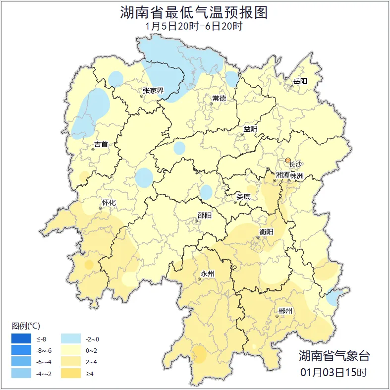 5日晚上至6日白天,多云到晴天;北風(fēng)2~3級;最低氣溫湘中以北-1~2℃,其他地區(qū)2~4℃;最高氣溫10~14℃。