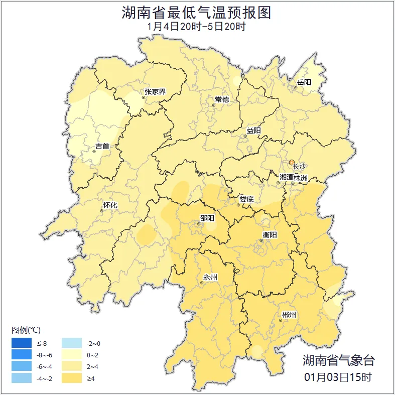 5日白天,全省大部分地區(qū)小雨轉(zhuǎn)陰天,其中高海拔山區(qū)有雨夾雪或小雪;北風(fēng)2~3級;最低氣溫湘北2~4℃,其他地區(qū)4~6℃;最高氣溫湘南7~9℃,其他地區(qū)9~11℃。