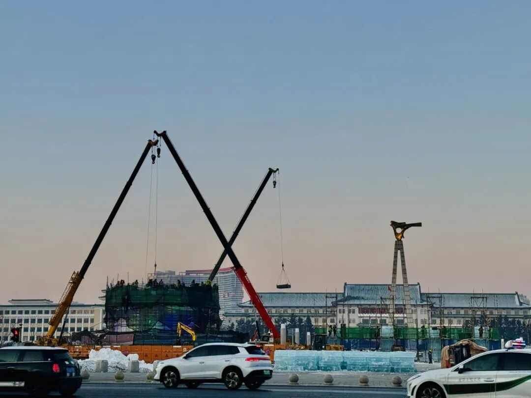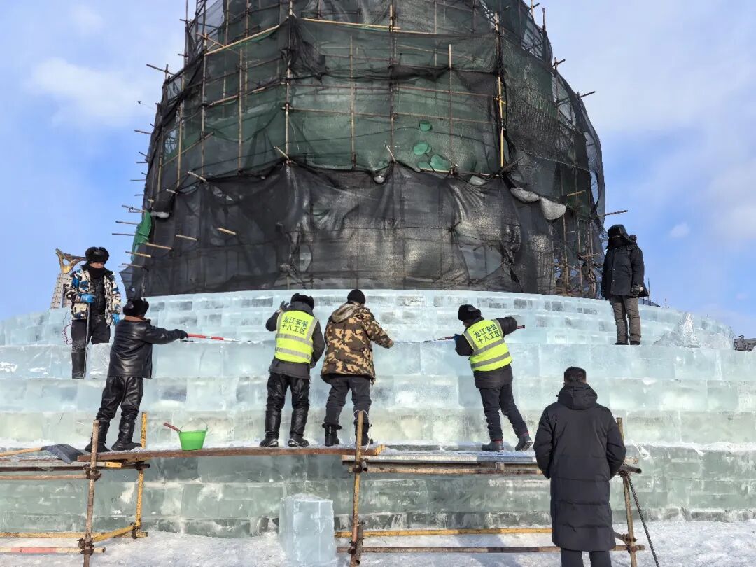 現(xiàn)場(chǎng),多名冰雕師揮舞電鋸、冰鏟,將大塊冰塊雕琢成精美藝術(shù)品。吊車(chē)緩緩吊起冰塊至頂部,師傅們小心翼翼地拼接、固定。