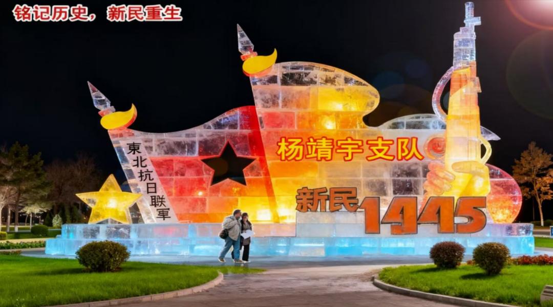 新民大街與解放大路交叉口附近的“東北抗聯(lián)精神組雕”,以“銘記歷史,新民重生”為主題,融合抗聯(lián)旗幟、步槍造型與“新民1445”精神堡壘,通過(guò)分層雕刻與紅黃燈光渲染,在晶瑩冰體中塑造出富有張力的歷史場(chǎng)景。