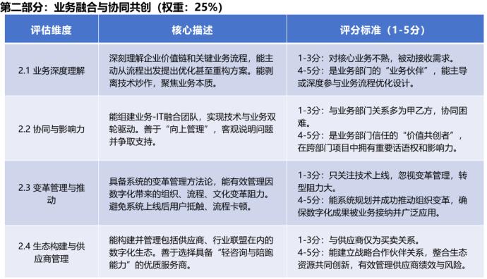 第三,動態(tài)調整評估維度:CIO的能力模型并非一成不變,需隨技術演進與企業(yè)戰(zhàn)略迭代,定期更新評估維度與權重;