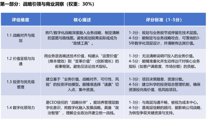 第二,結合企業(yè)實際環(huán)境:評估標準需匹配企業(yè)的數字化轉型階段、行業(yè)特性及核心挑戰(zhàn)——比如初創(chuàng)企業(yè)與成熟集團對CIO的要求應有差異;