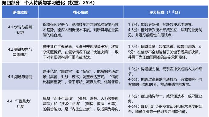 而軟實力則體現在不可直接量化卻影響深遠的非技術能力上,涵蓋戰(zhàn)略思維與業(yè)務洞察、溝通協(xié)作、變革領導力、組織影響力、個人韌性等維度。話不多說,直接附上測評表: